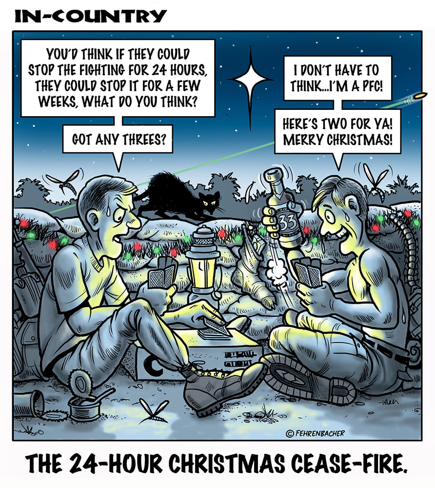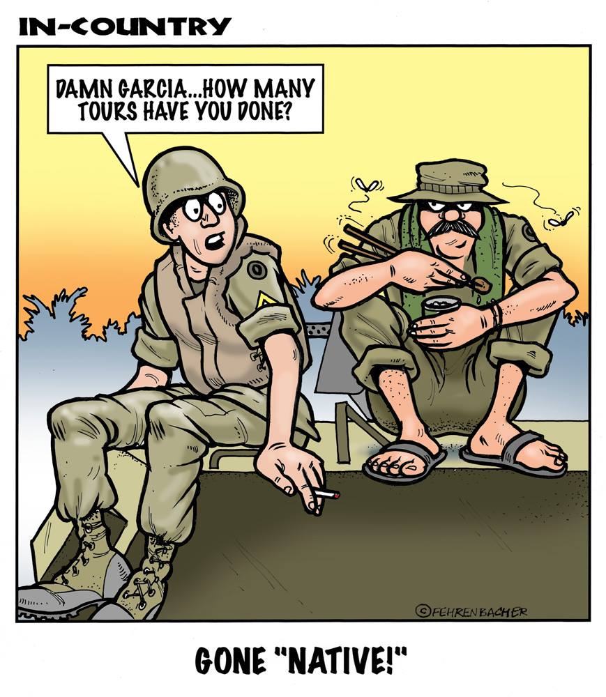 Phil enlisted in the Army in 1965 where he served for years in Vietnam. He became a graphic designer and has worked for the state of Oregon for 26 years. He retired in 2003 and started the Cartoon "In-Country". The cartoons reflect his experiences during his tour of duty in South Vietnam.