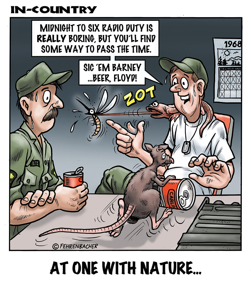 Phil enlisted in the Army in 1965 where he served for years in Vietnam.  He became a graphic designer and has worked for the state of Oregon for 26 years.  He retired in 2003 and started the Cartoon "In-Country".  The cartoons reflect his experiences during his tour of duty in South Vietnam.