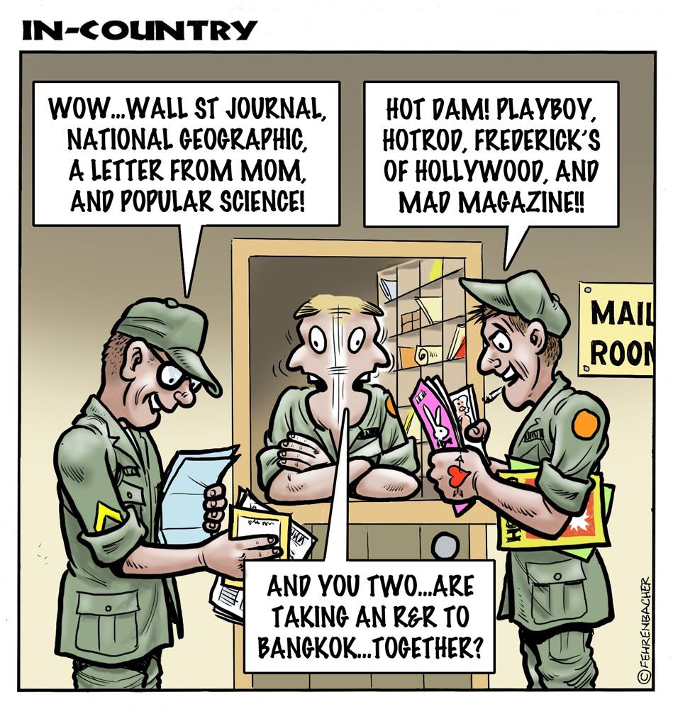 Phil enlisted in the Army in 1965 where he served for years in Vietnam. He became a graphic designer and has worked for the state of Oregon for 26 years. He retired in 2003 and started the Cartoon "In-Country". The cartoons reflect his experiences during his tour of duty in South Vietnam.