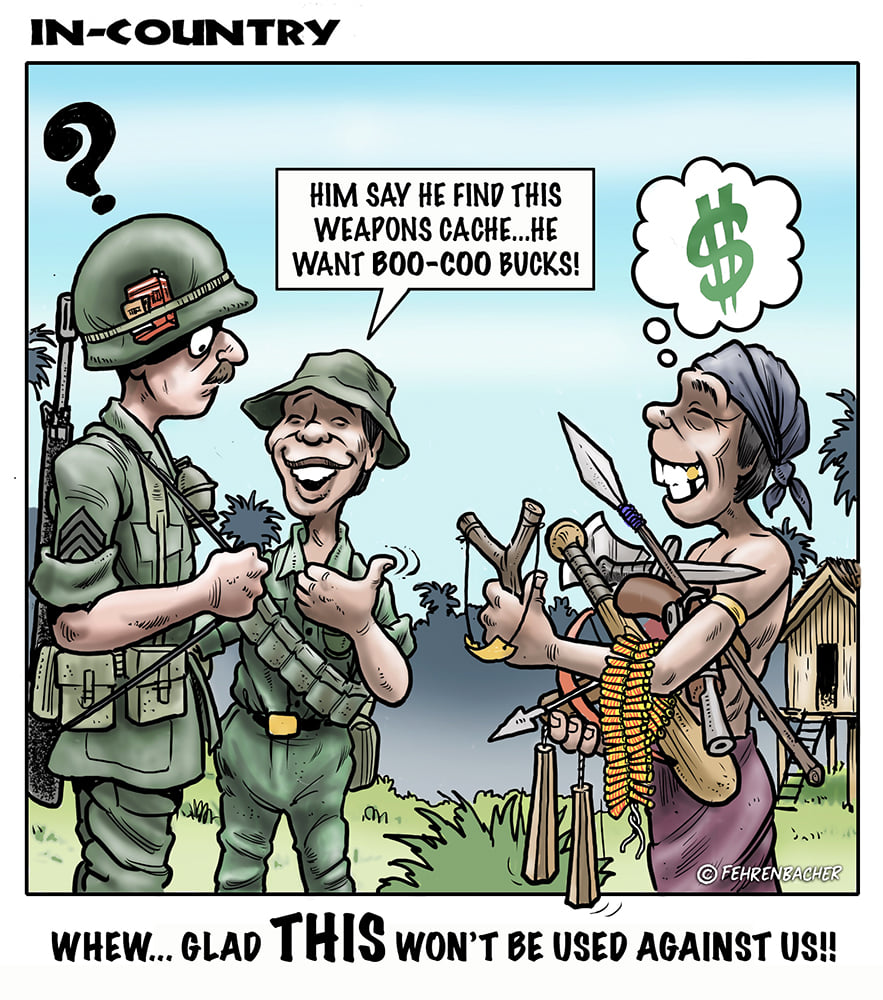 Phil enlisted in the Army in 1965 where you served for years in Vietnam. He became a graphic designer and has worked for the state of Oregon for 26 years. He retired in 2003 and started the Cartoon "In-Country". The cartoons reflect his experiences during his tour of duty in South Vietnam.