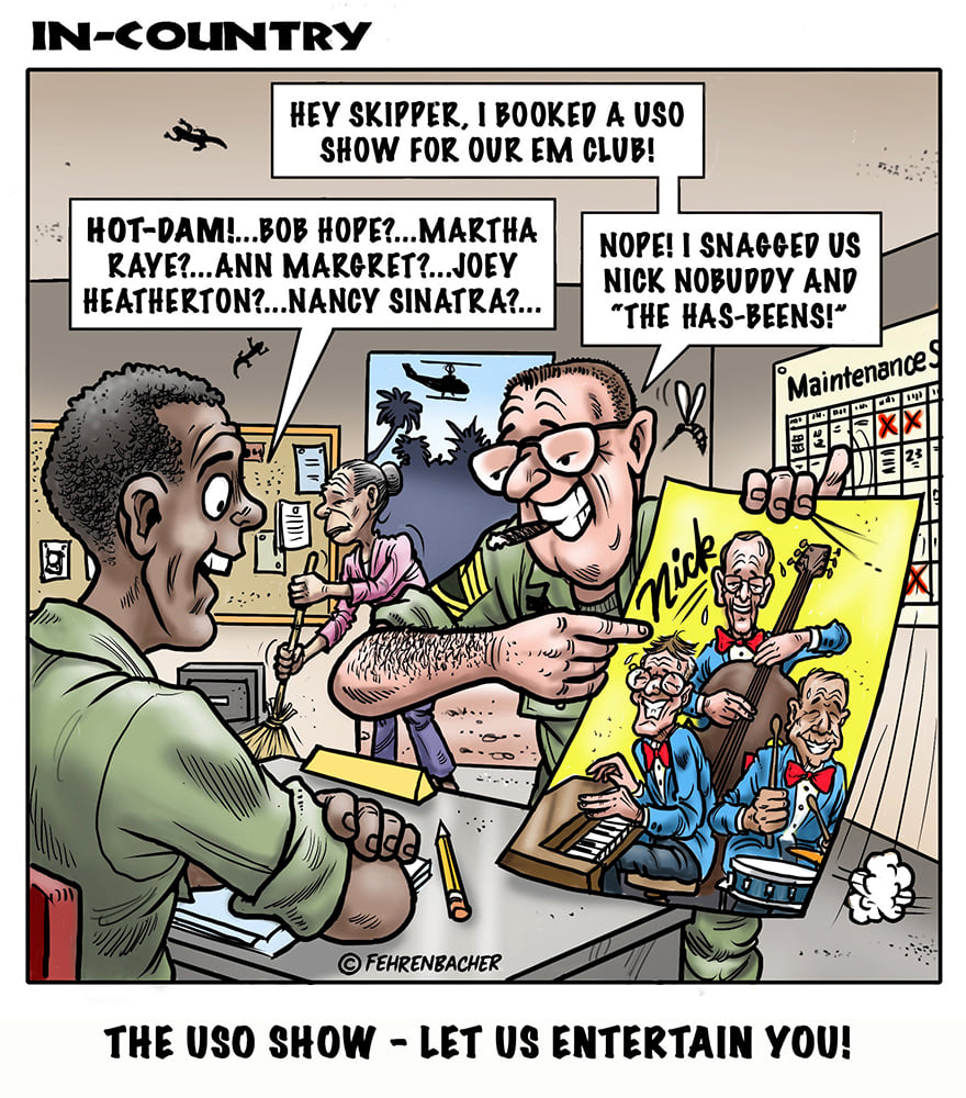 Phil enlisted in the Army in 1965 where he served for years in Vietnam. He became a graphic designer and has worked for the state of Oregon for 26 years. He retired in 2003 and started the Cartoon "In-Country". The cartoons reflect his experiences during his tour of duty in South Vietnam.