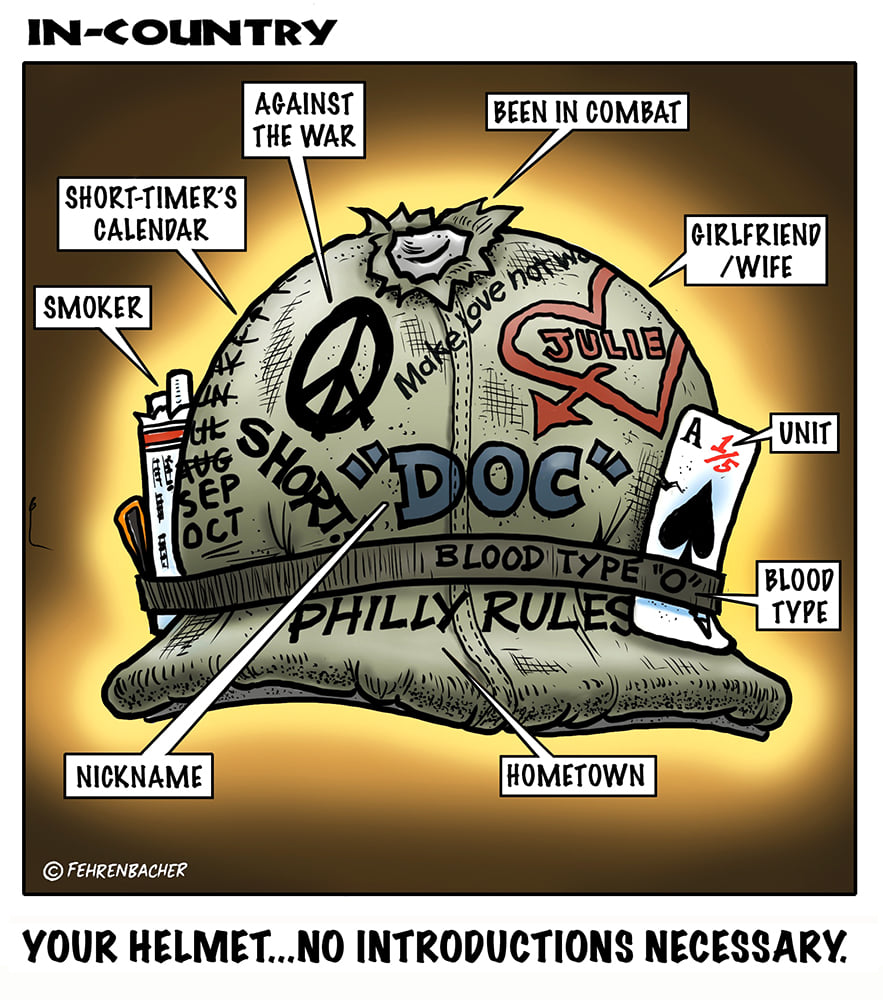 Phil enlisted in the Army in 1965 where he served for years in Vietnam.  He became a graphic designer and has worked for the state of Oregon for 26 years.  He retired in 2003 and started the Cartoon "In-Country".  The cartoons reflect his experiences during his tour of duty in South Vietnam.